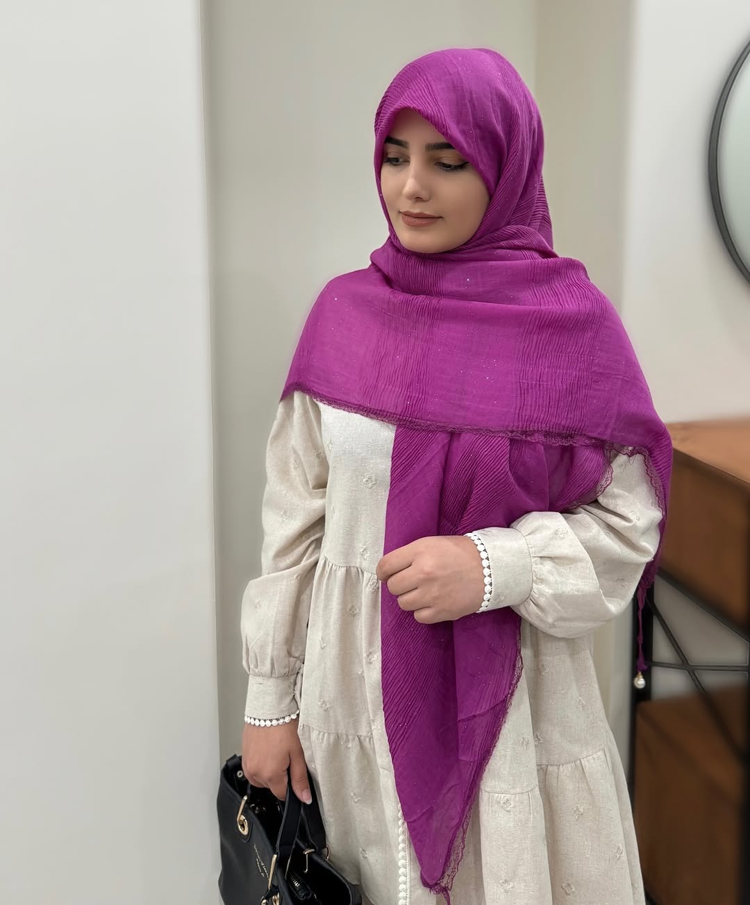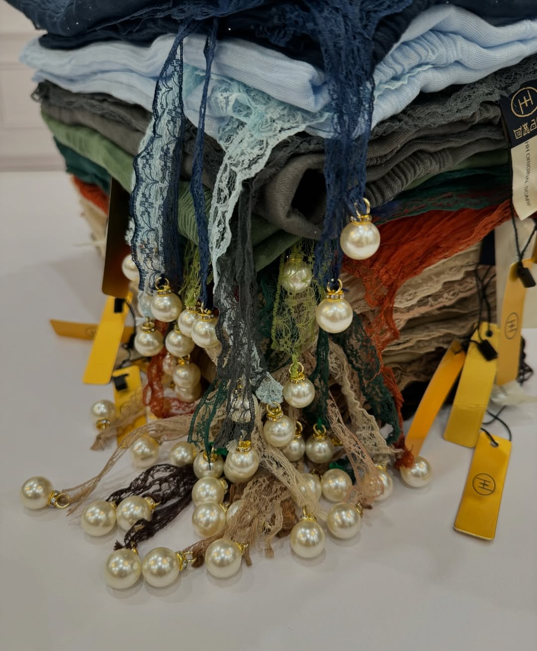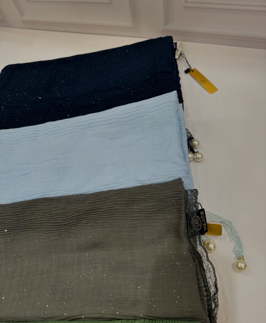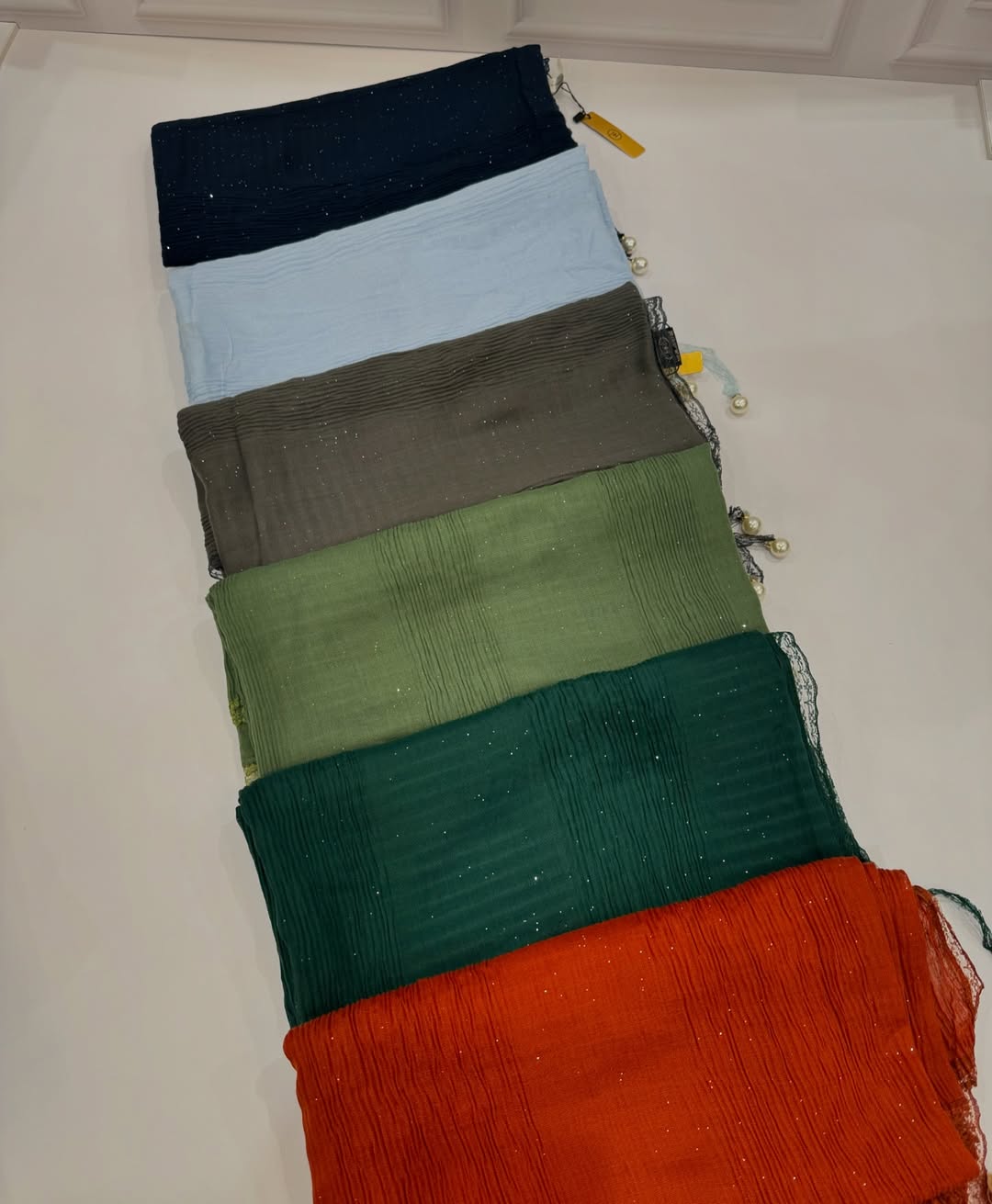 روسری ‌نخ پلیسه شاین وارداتی منگوله مرواریدی قواره 140 کد017