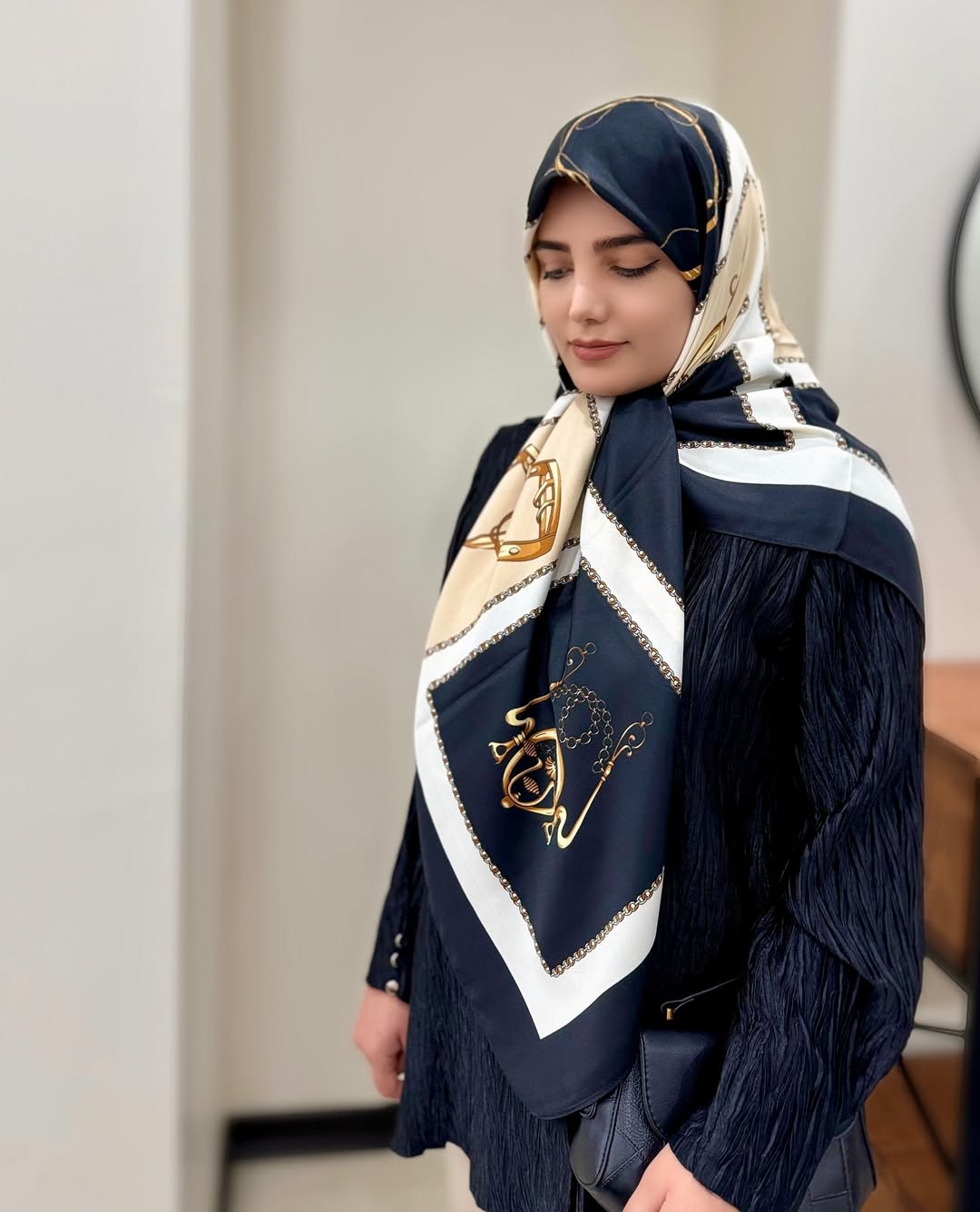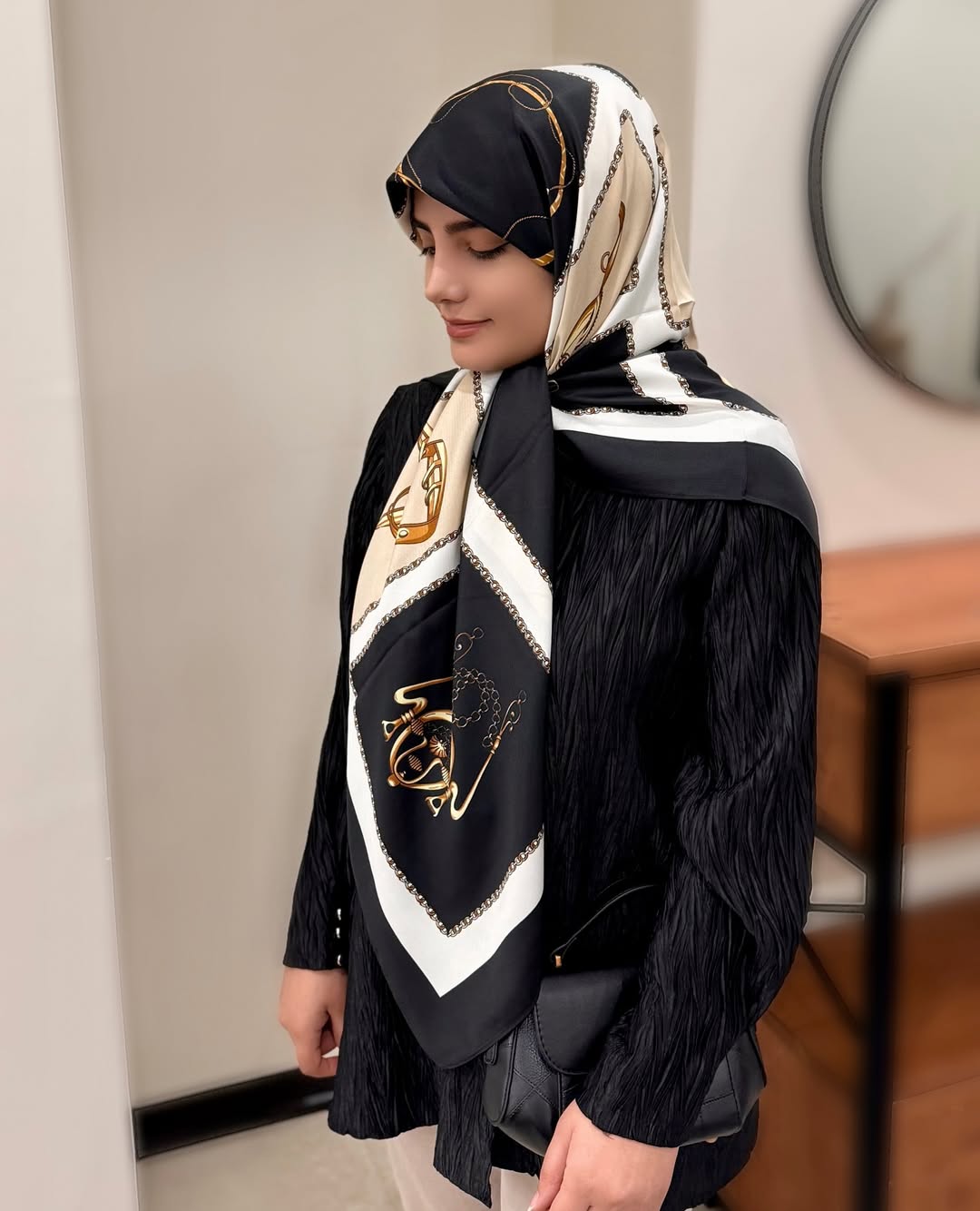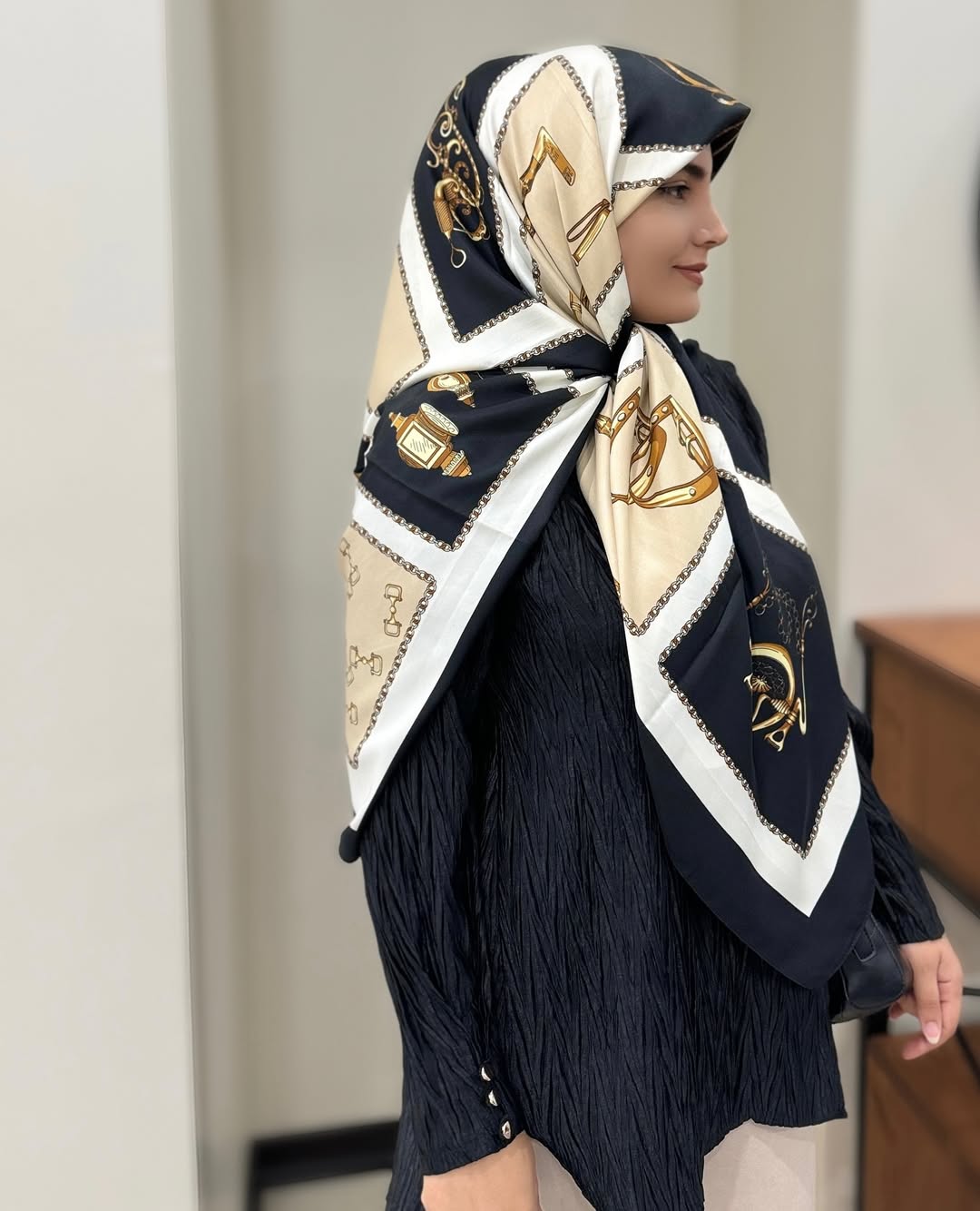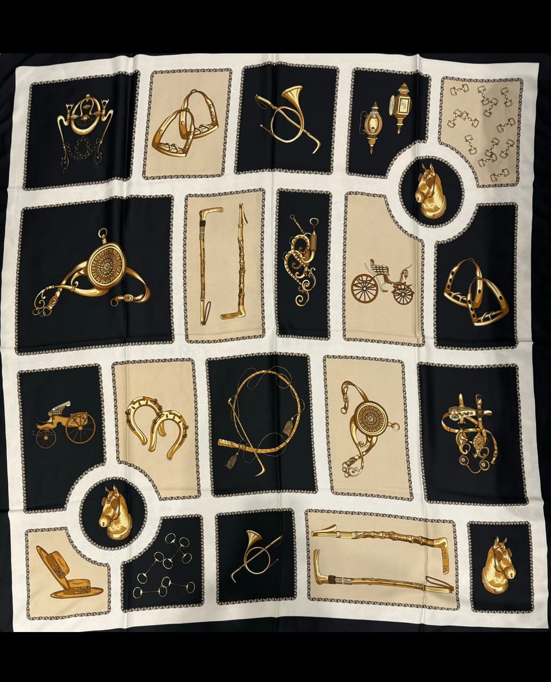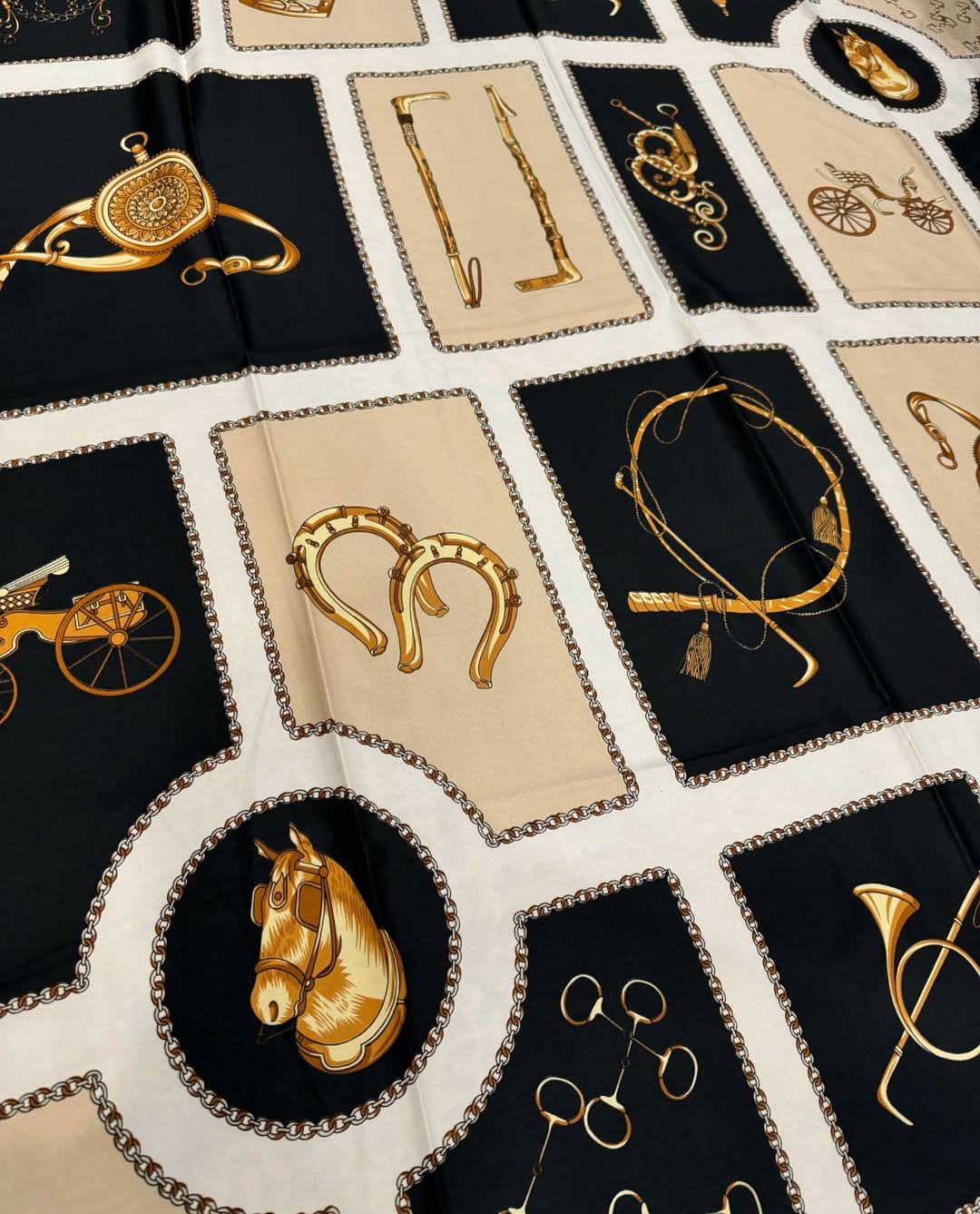 روسری ابریشم توییل هرمس مشکی کرم کد004