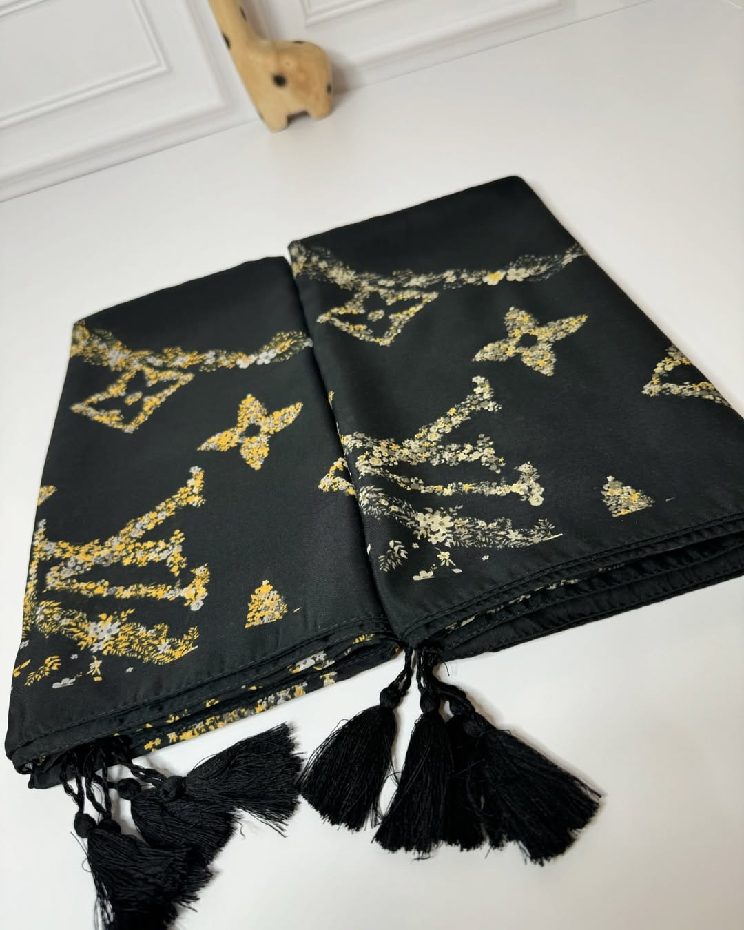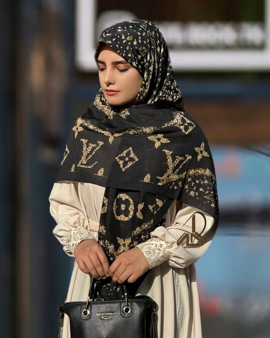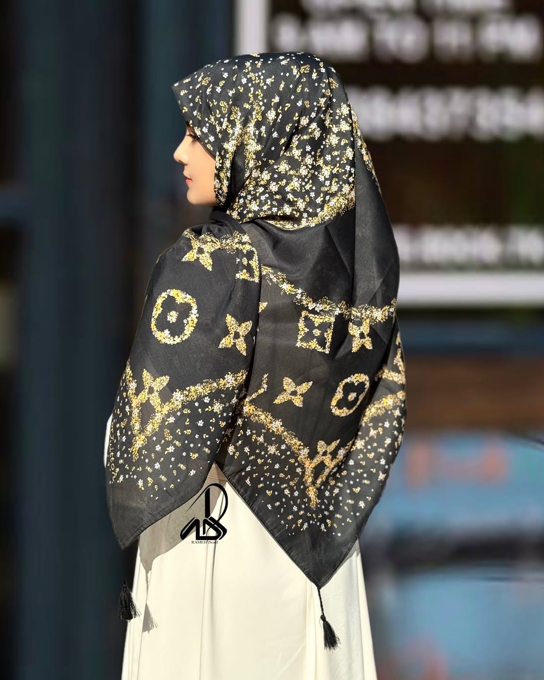 روسری نخ وال با پارچه ترک دور دوخت قواره حدود ۱۴۰ مشکی طلایی کد 054