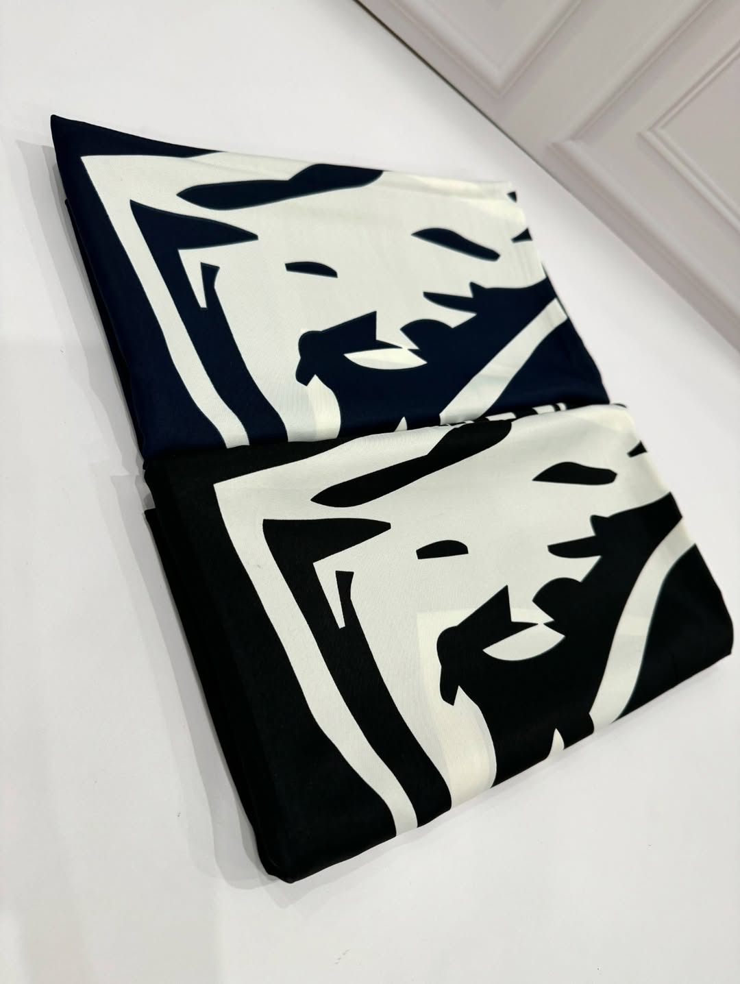متاسفانه این کالا در حال حاضر موجود نیست. میتوانید از طریق لیست بالای صفحه، از محصولات مشابه این کالا دیدن نمایید. روسری ابریشم توییل وارداتی ایستایی عالی دور چرخ قواره ۱۳۵ پشت سفید نیست در دو رنگ سرمه ای و مشکی موجوده